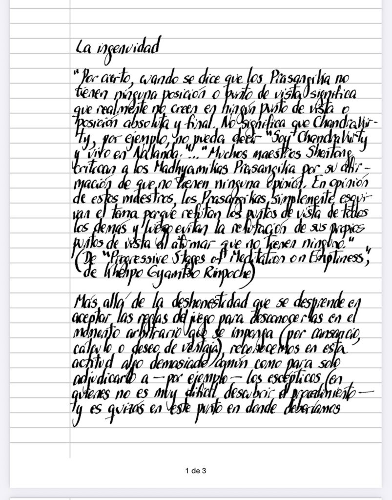 «Por cierto, cuando se dice que los Prasangika no tienen ninguna posición o punto de vista significa que realmente no creen en ningun punto de vista o posición absoluta y final. No significa que Chandrakirty, por ejemplo, no pueda decir «Soy Chandrakirty y vivo en Nalanda.»…»Muchos maestros Shentong critican a los Madhyamikas Prasangika por su afirmación de que no tienen ninguna opinión. En opinión de estos maestros, los Prasangikas simplemente esquivan el tema porque refutan los puntos de vista de todos los demás y luego evitan la refutación de sus propios puntos de vista al afirmar que no tienen ninguno.» (De «Progressive Stages of Meditation on Emptiness», de Khenpo Gyantso Rinpoche)