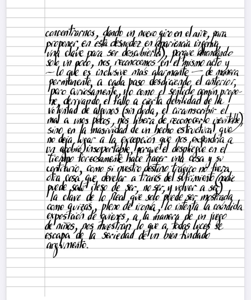 Más allá de la deshonestidad que se desprende en aceptar las reglas de juego para desconocerlas en el momento arbitrario que se imponga (por cansancio, cálculo o deseo de ventaja), reconocemos en esta actitud algo demasiado común como para solo adjudicarlo a – por ejemplo – los escépticos (en quienes no es muy difícil descubrir el procedimiento – y es quizás en este punto en donde deberíamos concentrarnos, dando un nuevo giro en el aire, para proponer, en esta desnudez en apariencia ingenua, una clave para ser descubierta), porque ahondando solo un poco, nos reconocemos en el mismo acto y – lo que es inclusive más alarmante – de manera permanente, a cada paso desdiciendo el anterior, pero curiosamente, no como el sentido común propone, derivando el fallo a cierta debilidad de la voluntad de algunos (sin duda, el circunscribir el mal a unos pocos, nos libera de reconocerlo inevitable sino en la masividad de un hecho estructural que no deja lugar a la excepción que nos expondría a un agobio insoportable, porque el despliegue en el tiempo forzosamente hace nacer una cosa y su contrario, como si nuestro destino trágico no fuera otra cosa que develar a través del sufrimiento (nadie puede salir ileso de ser, no ser, y volver a ser) la clave de lo Real que solo puede ser mostrada como quizás, pleno de ironía, lo intenta la cándida exposición de quienes, a la manera de un juego de niños, nos muestran lo que a todas luces se escapa de la seriedad de un bien fundado argumento.