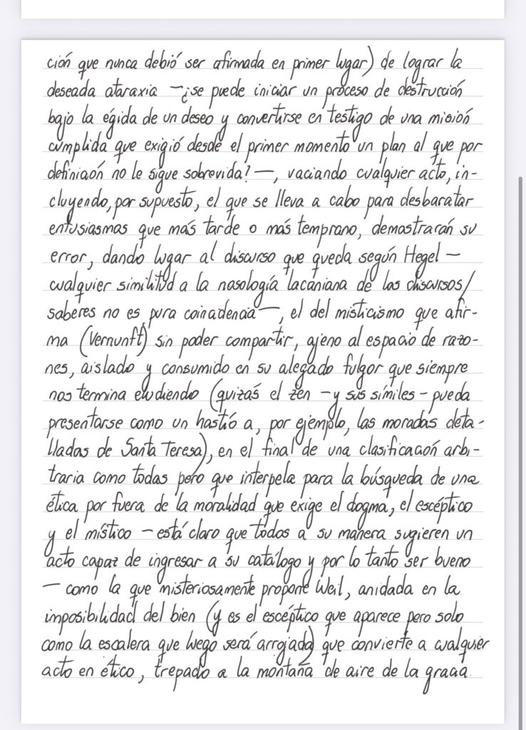 Cansados de la comprensión (la Verstand de Hegel) por sus promesas incumplidas (pero que de todas maneras no dejan de seducir aún al más avisado) – origen del dogmatismo —, también aparece la deuda de la razón negativa, epitomizada por el escepticismo, con Pirrón induciendo al ejercicio tedioso – aunque posible – de encontrar la cláusula contraria a la que invade a la cabeza, con el propósito (y es aquí donde acecha el desmoronamiento de un construcción que nunca debió ser afirmada en primer lugar) de lograr la deseada ataraxia – se puede iniciar un proceso de destrucción bajo la égida de un deseo y convertirse en testigo de una misión cumplida que exigió desde el primer momento un plan al que por definición no le sigue sobrevida? —, vaciando cualquier acto, incluyendo, por supuesto, el que se Ileva a cabo para desbaratar entusiasmos que más tarde o más temprano, demostrarán su error, dando lugar al discurso que queda según Hegel — cualquier similitud a la nosología lacaniana del los discursos/saberes no es pura coincidencia –, el del misticismo que afirma (Vernunft) sin poder compartir, ajeno al espacio de razones, aislado y consumido en su alegado fulgor que siempre nos termina eludiendo (quizás el zen – y sus símiles – pueda presentarse como un hastío a, por ejemplo, las mónadas detalladas de Santa Teresa), en el final de una clasificación arbitraria como todas pero que interpela para la búsqueda de una ética por fuera de la moralidad que exige el dogma, el escéptico y el mistico — esta claro que todos a su manera sugieren un acto capaz de ingresar a su catálogo y por lo tanto ser bueno –, como la que misteriosamente propone Weil, anidada en la imposibilidad del bien (y es el escéptico que aparece pero solo como la escalera que luego será arrojada) que convierte a cualquier acto en ético, trepado a la montaña de aire de la gracia.