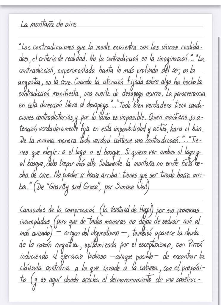 «Las contradicciones que la mente encuentra son las únicas realidades, el criterio de realidad. No la contradicción en la imaginación, la contradicción, experimentada hasta lo más profundo del ser, es la angustia, es la cruz. Cuando la atención fijada soblre algo ha hecho la contradicción manifiesta, una suerte de desapego ocurre. La perseverancia en esta dirección lleva al desapego.»…»Todo bien verdadero tiene condiciones contradictorias, y por lo tanto es imposible. Quien mantiene su atención verdaderamente fija en esta imposibilidad y actúa, hará el bien. De la misma manera toda verdad contiene una contradicción.»…»Tienes que elegir el lago o el bosque. Si quiero ver ambos el lago y el bosque debo trepar más alto, Solamente la montaña no existe. Está hecha de aire. No puedes ir hacia arriba: tienes que ser tirado hacia arriba.» (De «Gravity and Grace», por Simone Weil)