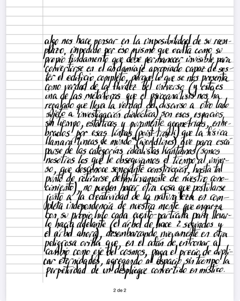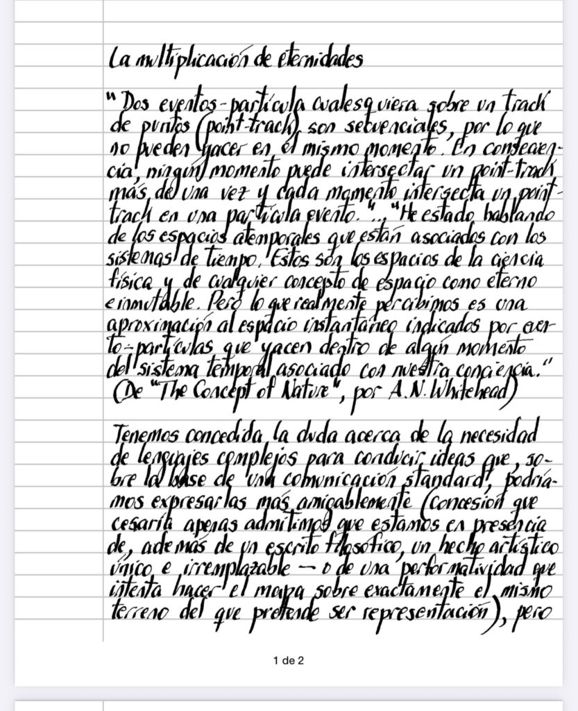 Tenemos concedida la duda acerca de la necesidad de lenguajes complejos para conducir ideas que, sobre la base de una comunicación standard, podríamos expresarlas mas amigablemente (concesión que cesaría apenas admitimos que estamos en presencia de, además de un escrito filosófico, un hecho artístico único e irremplazable – o de una performatividad que intenta hacer el mapa sobre exactamente el mismo terreno del que pretende ser representación), pero algo nos hace pensar en la imposibilidad de su reemplazo, impedido por eso mismo que oculta como su propio fundamento que debe permanecer invisible para convertirse en el andamiaje apropiado capaz de sostener el edificio completo, porque lo que se nos presenta como verdad de la fluidez del universo (y esto es una de las metáforas que el psicoanálisis nos ha regalado que lleva la verdad del discurso a otro lado sujeto a investigación dialéctica) son esos espacios sin tiempo, estáticos y puramente geométricos, enhebrados por esas líneas (point-track) que la física llamará “líneas de mundo» (World Lines) que para escaparse de las categorías idealistas kantianas (somos nosotros los que le obsequiamos el tiempo al universo, que desconoce semejante construcción, hasta tal punto de retirarse definitivamente de nuestro conocimiento), no pueden hacer otra cosa que postularse junto a la creatividad de la naturaleza en completa independencia de nuestra mente que engarza con su propio hilo cada evento-partícula para llevarlo hacia adelante (el árbol de hace 2 segundos y el árbol ahora), desembarcando nuevamente en otra peligrosa orilla que, en el afán de entronar al cambio como eje del cosmos, paga el precio de duplicar eternidades, agregando al espacio sin tiempo la perpetuidad de un despliegue convertido en místico.