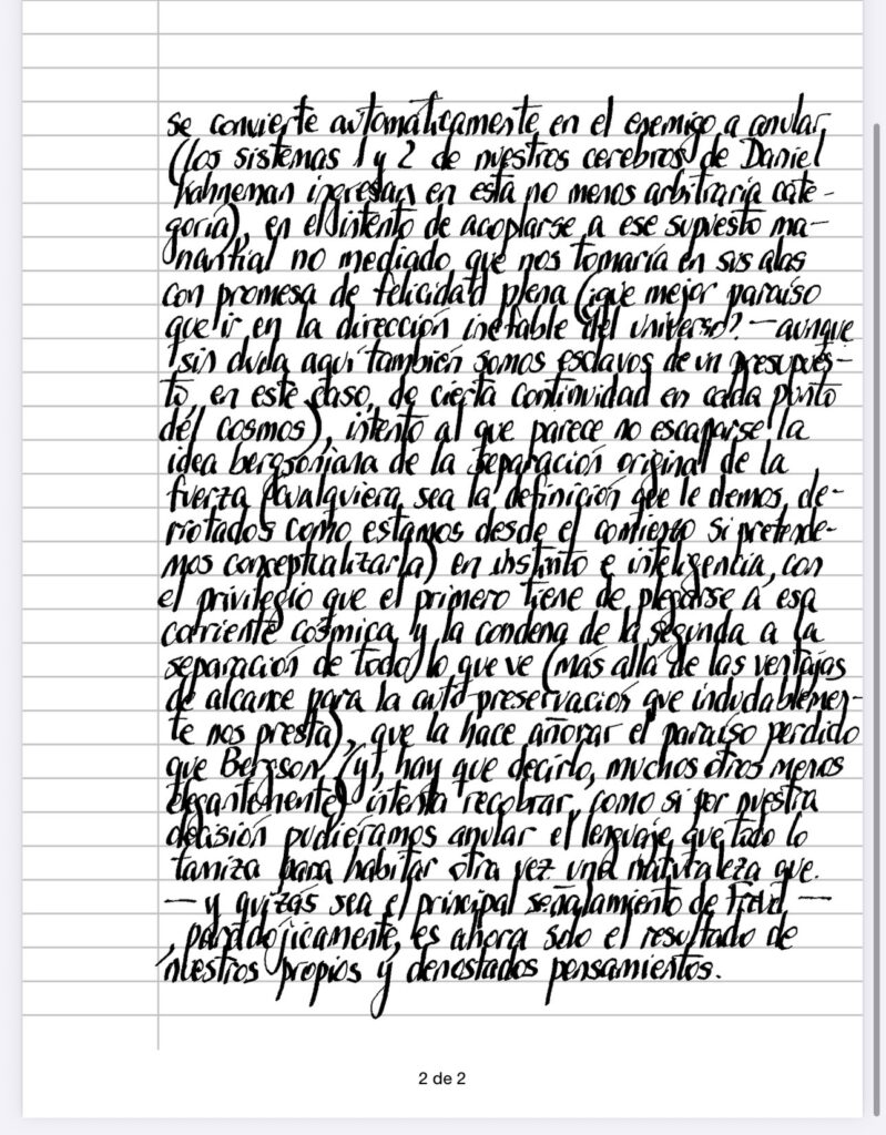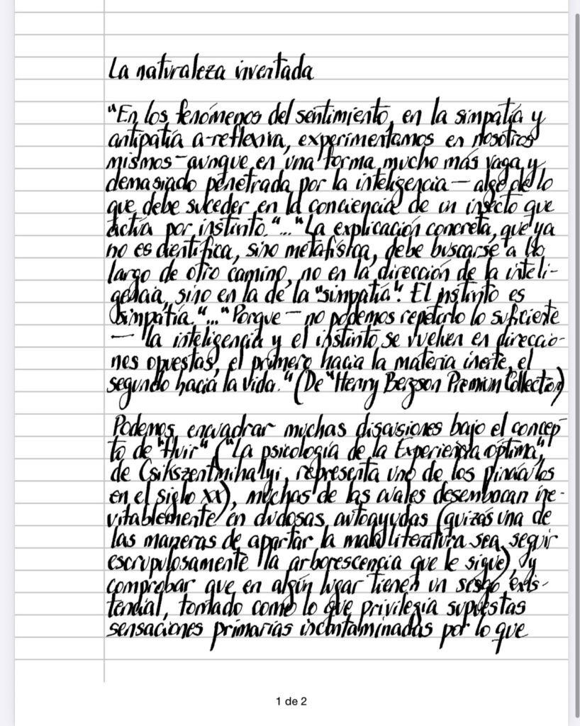 Podemos encuadrar muchas discusiones bajo el concepto de «fluir» («La psicología de la Experiencia óptima,» de Csikszentmihalyi, representa uno de los pináculos en el siglo XX), muchas de las cuales desembocan inevitablemente en dudosas autoayudas (quizá una de las maneras de apartar la mala literatura sea seguir escrupulosamente la arborescencia que le sigue), y comprobar que en algún lugar tienen un sesgo existencial, tomado como lo que privilegia supuestas sensaciones primarias incontaminadas por lo que se convierte automáticamente en el enemigo a anular (los sistemas 1 y 2 de nuestros cerebros de Daniel Kahneman ingresan en esta no menos arbitraria categoría), en el intento de acoplarse a ese supuesto manantial no mediado que nos tomaría en sus alas con promesa de felicidad plena (¿que mejor paraíso que ir en la dirección inefable del universo? – aunque sin duda aquí también somos esclavos de un presupuesto, en este caso, de cierta continuidad en cada punto del cosmos), intento al que parece no escaparse la idea bergsoniana de la separación original de la fuerza (cualquiera sea la definición que le demos, derrotados como estamos desde el comienzo si pretendemos conceptualizara) en instinto e inteligencia, con el privilegio que el primero tiene de plegarse a esa corriente cósmica y la condena de la segunda a la separación de todo lo que ve (más allá de las ventajas de alcance para la auto-preservación que indudablemente nos presta), que la hace añorar el paraíso perdido que Bergsonc(y, hay que decirlo, muchos otros menos elegantemente) intenta recobrar, como si por nuestra decisión pudiéramos anular el lenguaje que todo lo tamiza para habitar otra vez una naturaleza que – y quizás sea el principal señalamiento de Freud -, paradójicamente, es ahora solo el resultado de nuestros propios y denostados pensamientos.