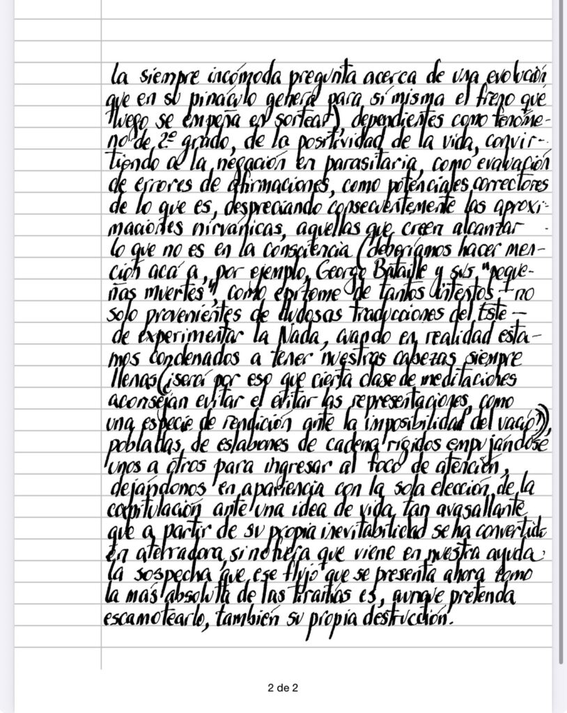 Si lo que verdaderamente es consiste en esa duración, en ese flujo creativo, en esa avalancha impredecible hacia adelante, entonces, sin duda la Nada no existe, o mas bien, es producto de nuestro intelecto y solo a modo de negación, que, dicho sea de paso, tampoco lleva una existencia autónoma y que debe su mención a los meandros de nuestro intelecto, ávido de obstáculos destinados a ser los diques en donde se posibilite la predicción sobre sustantivos (queda por verse la siempre incómoda pregunta acerca de una evolución que en su pináculo genera para sí misma el freno que luego se empeña en sortear), dependientes como fenómeno de 2º grado, de la positividad de la vida, convirtiendo a la negación en parasitaria, como evaluación de errores de afirmaciones, como potenciales correctores de lo que es, despreciando consecuentemente las aproximaciones nirvánicas, aquellas que creen alcanzar lo que no es en la consciencia (deberíamos hacer mención acá a, por ejemplo, George Bataille y sus «pequeñas muertes», como epítome de tantos intentos – no solo provenientes de dudosas traducciones del Este – de experimentar la Nada, cuando en realidad estamos condenados a tener nuestras cabezas siempre llenas (¿será por eso que cierta clase de meditaciones aconsejan evitar el evitar las representaciones, como una especie de rendición ante la imposibilidad del vacío?)), pobladas de eslabones de cadena rígidos empujándose unos a otros para ingresar al foco de atención, dejándonos en apariencia con la sola elección de la capitulación ante una idea de vida tan avasallante que a partir de su propia inevitabilidad se ha convertido en aterradora, si no fuera que viene en nuestra ayuda la sospecha que ese flujo que se presenta ahora como la más absoluta de las tiranías es, aunque pretenda escamotearlo, también su propia destrucción.