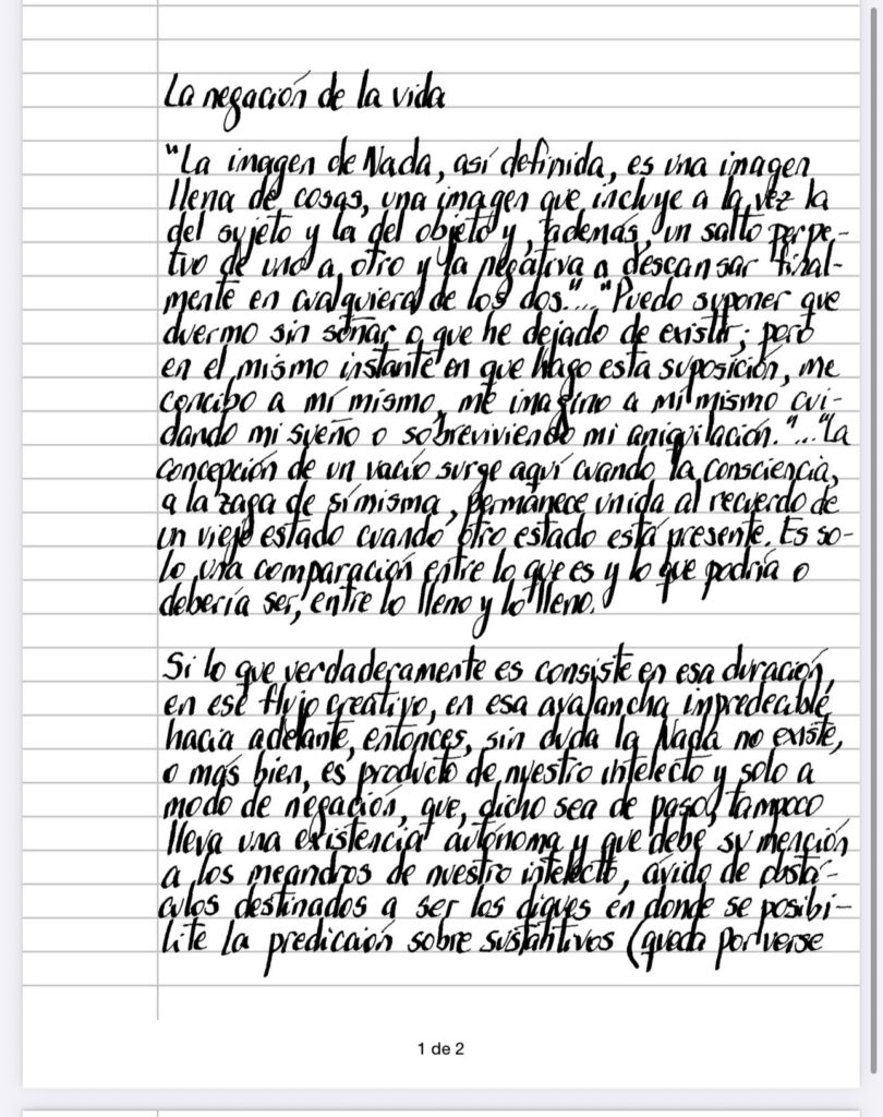 «La imagen de Nada, así definida, es una imagen llena de cosas, una imagen que incluye a la vez la del sujeto y la del objeto y, además, un salto perpetuo de uno a otro y la negativa a descansar finalmente en cualquiera de los dos.»…»Puedo suponer que duermo sin soñar o que he dejado de existir; pero en el mismo instante en que hago esta suposición, me concibo a mí mismo, me imagino a mí mismo cuidando mi sueño o sobreviviendo mi aniquilación.»…»La concepción de un vacío surge aquí cuando la consciencia, a la zaga de sí misma, permanece unida al recuerdo de un viejo estado cuando otro estado está presente. Es solo una comparación entre lo que es y lo que podría o debería ser, entre lo lleno y lo lleno.” (De “Henry Bergson Premium Collection”)