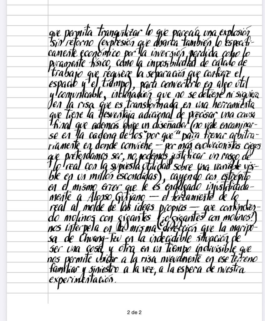 Parece ser clara la utilidad de la inveterada tendencia a la neutralización, aplicada mucho mas frecuentemente de lo que podría imaginarse, quizás por lo insostenible que supone una contradicción sincrónica, que precisa de dos pasos para su asimilación, el primero, su apertura en los 2 términos opuestos y su despliegue en el tiempo (no será este uno de los misterios de su existencia;» la posibilidad misma de la dialéctica que separa para juntar?), que prepara el segundo, a saber, la desesperada búsqueda de ese tercer termino que permita tranquilizar lo que parecía una explosión sin retorno (expresión que abarca también lo específicamente económico por la inversión perdida como lo puramente físico, como la imposibilidad de cálculo de trabajo que requiere la separación que confiere el espacio y el tiempo), para convertirlo en algo útil y comunicable, inclinación que no se detiene ni siquiera en la risa que es transformada en una herramienta que tiene la desventaja adicional de precisar una causa final que además exige un diseñador (no vale encaminarse en la cadena de los «por qué» para frenar arbitrariamente en donde conviene – por mas evolucionistas ciegos que pretendamos ser, no podemos justificar un rasgo de lo real con la supuesta utilidad sobre una variable visible en un millón escondidas), cayendo con estrépito en el mismo error que le es endilgado injustificadamente a Alonso Quijano – el forzamiento de lo real al molde de las ideas propias – que confundiendo molinos con gigantes (¿o gigantes con molinos?) nos interpela en la misma dirección que la mariposa de Chuang-Tzu en la indecidible situación de ser una cosa y otra en un tiempo indivisible que nos permite ubicar a la risa nuevamente en ese terreno familiar y siniestro a la vez, a la espera de nuestra experimentación.