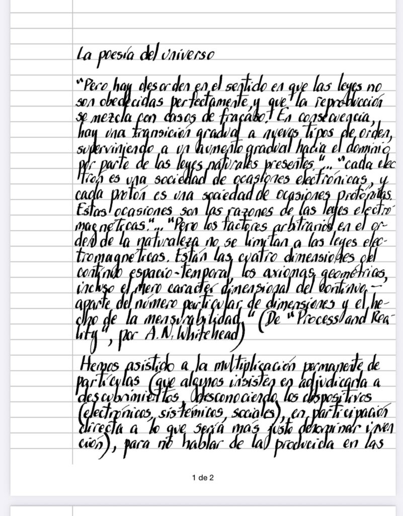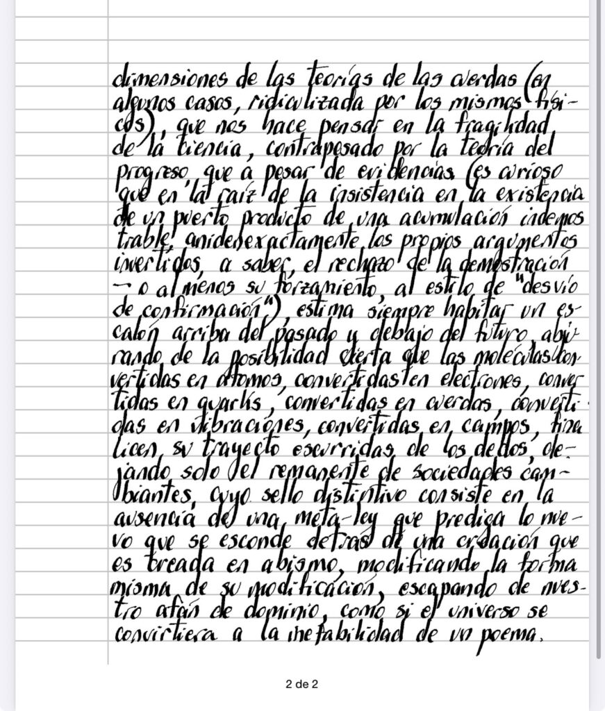 Hemos asistido a la multiplicación permanente de partículas (que algunos insisten en adjudicarla a descubrimientos, desconociendo los dispositivos (electrónicos, sistémicos, sociales), en participación directa a lo que sería más justo denominar invención), para no hablar de la producida en las dimensiones de las teorías de las cuerdas (en algunos casos, ridiculizada por los mismos físicos), que nos hace pensar en la fragilidad de la ciencia, contrapesado por la teoría del progreso, que a pesar de evidencias (es curioso que en la raíz de la insistencia en la existencia de un puerto producto de una acumulación indemostrable, aniden exactamente los propios argumentos invertidos, a saber, el rechazo de la demostración – o al menos su forzamiento, al estilo de «desvío de confirmación»), estima siempre habitar un escalón arriba del pasado y debajo del futuro, abjurando de la posibilidad cierta que las moléculas convertidas en átomos, convertidas en electrones, convertidas en quarks, convertidas en cuerdas, convertidas en vibraciones, convertidas en campos, finalicen su trayecto escurridas de los dedos, dejando solo el remanente de sociedades cambiantes, cuyo sello distintivo consiste en la ausencia de una meta-ley que prediga lo nuevo que se esconde detrás de una creación que es creada en abismo, modificando la forma misma de su modificación, escapando de nuestro afán de dominio, como si el universo se convirtiera a la inefabilidad de un poema.