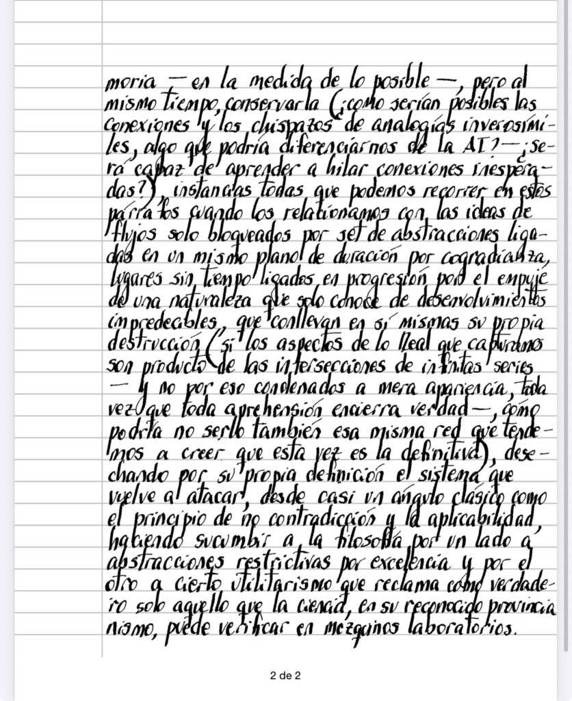 Quizá otra de las virtudes de la filosofía a golpes de párrafo (en otros comentarios nos hemos plegado al concepto de «filosofía a martillazos» que no está del todo ajustado a lo que hacemos), sea la de permitirnos un juego con cierto vértigo entre lo que unas pocas líneas dicen y el resto de una obra, variando el peso de uno y otro de manera un tanto azarosa, sin forzar en camas de Procusto (cortar piernas y brazos es indispensable para dar clases de filosofía), obligándonos a nosotros mismos a perder la memoria – en la medida de lo posible -, pero al mismo tiempo conservarla (¿como serían posibles las conexiones y los chispazos de analogías inverosímiles, algo que podría diferenciarnos de la AI?¿será capaz de aprender a hilar conexiones inesperadas?), instancias todas que podemos recorrer en estos párrafos cuando los relacionamos con las ideas de flujos solo bloqueados por set de abstracciones ligadas en un mismo plano de duración por cogradianza, lugares sin tiempo ligados en progresión por el empuje de una naturaleza que solo conoce de desenvolvimientos impredecibles, que conllevan en sí mismas su propia destrucción (si los aspectos de lo Real que capturamos son producto de las intersecciones de infinitas series – y no por eso condenados a mera apariencia, toda vez que toda aprehensión encierra verdad -, como podría no serlo también esa misma red que tendemos a creer que esta vez es la definitiva), desechando su propia definición el sistema que vuelve a atacar, desde casi un ángulo clásico como el principio de no contradicción y la aplicabilidad, haciendo sucumbir a la filosofía por un lado a abstracciones restrictivas por excelencia y por el otro a cierto utilitarismo que reclama como verdadero solo aquello que la ciencia, en su reconocido provincianismo, puede verificar en mezquinos laboratorios.