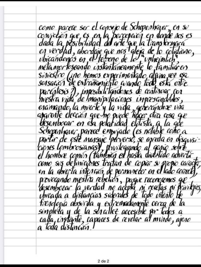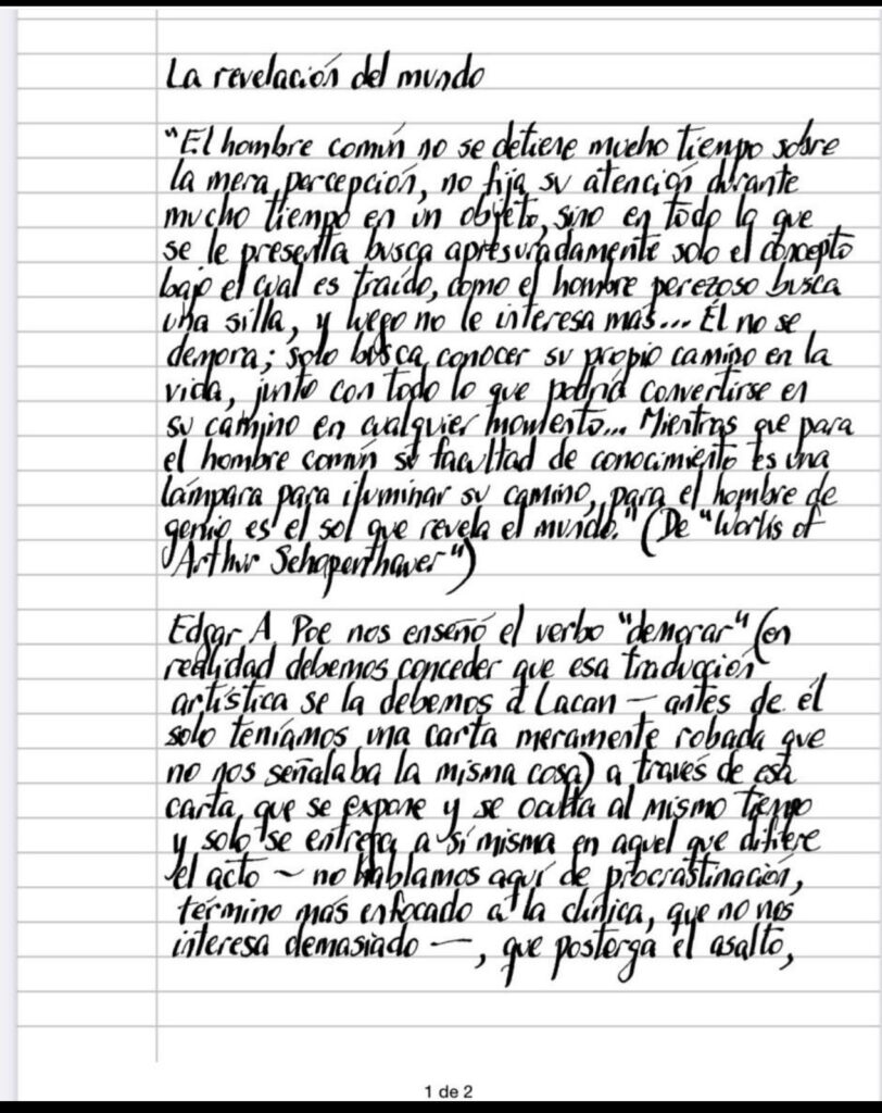 Edgar A. Poe nos enseñó el verbo «demorar» (en realidad debemos conceder que esa traducción artística se la debemos a Lacan — antes de él solo teníamos una carta meramente robada que no nos señalaba la misma cosa) a través de esa carta, que se expone y se oculta al mismo tiempo y solo se entrega a sí misma en aquel que difiere el acto — no hablamos aquí de procrastinación, término más enfocado a la clínica, que no nos interesa demasiado —, que posterga el asalto, como parece ser el consejo de Schopenhauer, en su convicción que es en la percepción en donde nos es dada la posibilidad del arte que la transformará en verdad, abordaje que nos aleja de lo cotidiano, ubicándonos en el terreno de lo «unheimlich», metamorfoseando instantáneamente lo familiar en siniestro (¿no hemos experimentado alguna vez esa sensación de extrañamiento cuando todo está entre paréntesis?), imposibilitándonos de continuar con nuestra vida de manipulaciones imprescindibles, encimando la muerte y la vida, generándose una aparente elección que no puede hacer otra cosa que desembocar en esa polaridad elitista a la que Schopenhauer parece empujado (es notable como a partir de este mensaje perverso, se enreda en disquisiciones lombrosianas), privilegiando al genio sobre el hombre común (también es hasta divertido advertir como sus definiciones tratan de copiar su propio carácter, en la abierta intención de permanecer en el lado correcto), provocando nuestra rebelión, porque reconocemos que desembozar la verdad no acepta ni recetas ni privilegios, ubicada a distancias siderales de todo intento de frenología absurda y extremadamente cerca de la simpleza y de la sencillez accesible por todos a cada instante, capaces de revelar al mundo, ajeno a toda distinción.