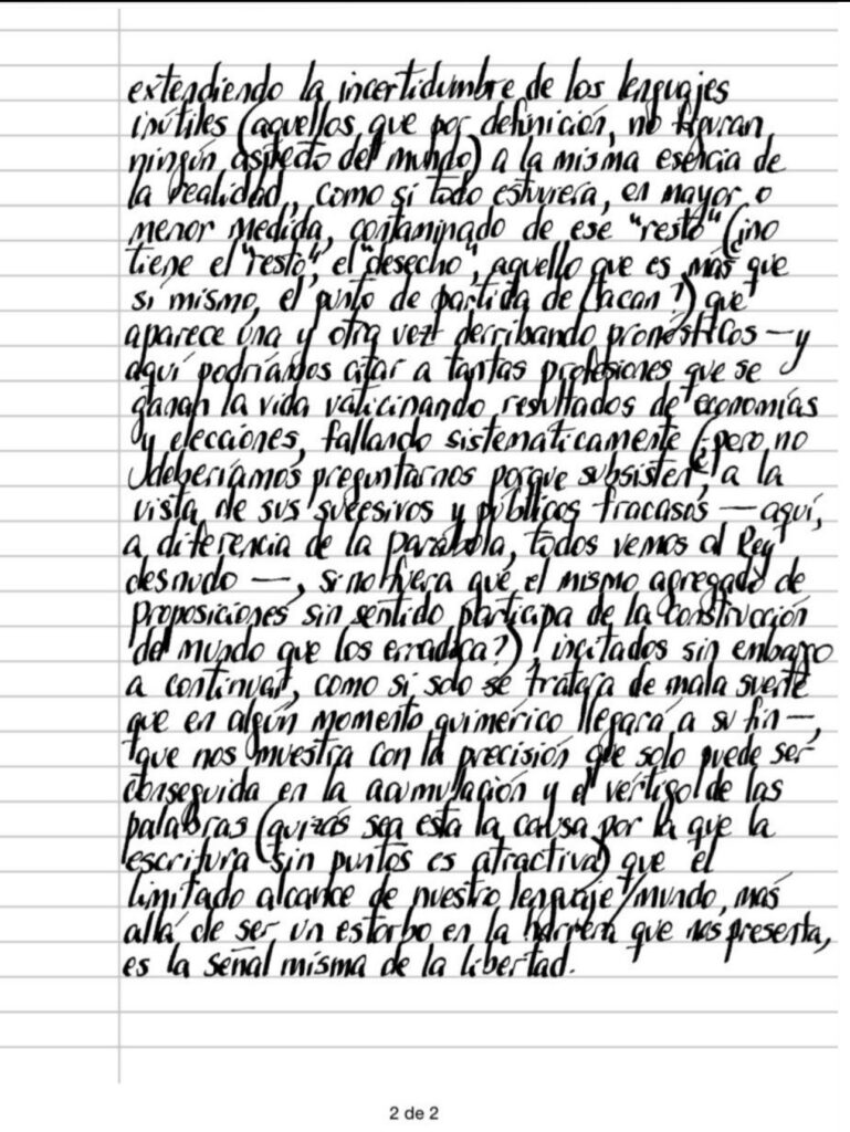 Por un lado tenemos la base lógica común que permite que habitemos nuestro lenguaje/mundo, que a la vez debería permitir — al menos en el lenguaje científico, evitando toda referencia a la ética, la estética y la metafísica, que no mapean nada — a partir de su capacidad de deducción e inferencia, conocer hechos en el futuro, que es en definitiva lo que la ciencia hace en sus laboratorios, y por otro Wittgenstein establece la imposibilidad de predicción, extendiendo la incertidumbre de los lenguajes inútiles (aquellos que por definición, no figuran ningún aspecto del mundo) a la misma esencia de la realidad, como si todo estuviera, en mayor o menor medida, contaminado de ese «resto» (¿no tiene el «resto», el «desecho», aquello que es más que sí mismo, el punto de partida de Lacan?) que aparece una y otra vez derribando pronósticos — y aquí podríamos citar a tantas profesiones que se ganan la vida vaticinando resultados de economías y elecciones, fallando sistemáticamente (¿pero no deberíamos preguntarnos por qué subsisten a la vista de sus sucesivos y públicos fracasos — aquí, a diferencia de la parábola, todos vemos al Rey desnudo —, si no fuera que el mismo agregado de proposiciones sin sentido participa de la construcción del mundo que los erradica?) incitados sin embargo a continuar, como si solo se tratara de mala suerte que en algún momento quimérico llegará a su fin — que nos muestra con la precisión que solo puede ser conseguida en la acumulación y el vértigo de las palabras (quizás sea esta la causa por la que la escritura sin puntos es atractiva) que el limitado alcance de nuestro lenguaje/mundo, más allá de ser un estorbo en la barrera que nos presenta, es la señal misma de la libertad.