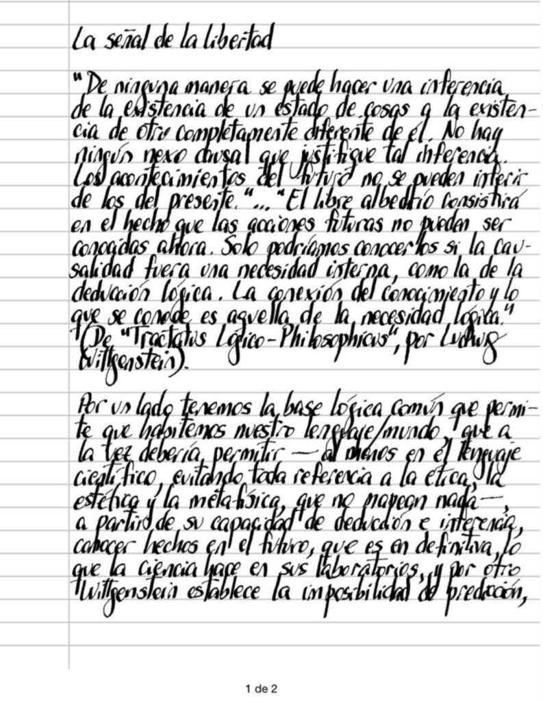 «De ninguna manera se puede hacer una inferencia de la existencia de un estado de cosas a la existencia de otro completamente diferente de él. No hay ningún nexo causal que justifique tal inferencia. Los acontecimientos del futuro no se pueden inferir de los del presente.» … «El libre albedrío consistirá en el hecho que las acciones futuras no pueden ser conocidas ahora. Solo podríamos conocerlos si la causalidad fuera una necesidad interna, como la de la deducción lógica. La conexión del conocimiento y lo que se conoce es aquella de la necesidad lógica.» (De «Tractatus Logico -Philosophicus», por Ludwig Wittgenstein).
