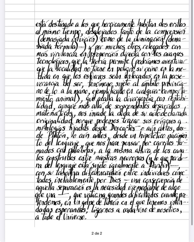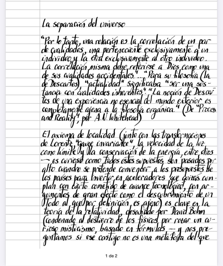 El axioma de localidad (junto con las transformaciones de Lorentz, «gauge invariance», la velocidad de la luz como límite y la conservación de la energía, entre otros – es curioso como todos estos supuestos son pasados por alto cuando se pretende convencer a los presupuestos de los países para invertir en aceleradores que quizá cumplan con cierto cometido de avance tecnológico, con argumentos de gran efecto como el descubrimiento de un Todo al que por definición es ajeno) es clave en la teoría de la relatividad, desafiado por David Bohm (condenado al destierro de los físicos por rozar un curioso misticismo, basado en fórmulas – y nos preguntamos si ese castigo no es una metáfora del que está destinado a los que heroicamente habitan dos orillas al mismo tiempo, desalojados tanto de la comprensión (demasiada intuición) como de la iluminación (demasiada fórmula)) y por muchos otros, relegados con más virulencia en proporción directa con los avances tecnologicos que la teoría permite (podríamos aventurar que la localidad no tiene en peligro su reino en la medida en que los esfuerzos sean enfocados en la perseverancia del ser, fenómeno sujeto al ámbito provinciano de lo a la mano, ejemplificado en cualquier comportamiento animal, que acalla la divergencia con rentabilidad, aunque más allá de sorprendentes desarrollos matemáticos, nos invade la duda de su autodeclarada originalidad porque podemos trazar sus orígenes a Descartes – o aún antes, Platón, o aún antes, desde un hipotético nacimiento del lenguaje, que nos hace pensar por carriles con palabras, a la misma altura de los construidos entre nuestras neuronas (y lo que perdura del lenguaje está sujeto igualmente a Darwin), con su taxativa diferenciación entre individuos conectados inefablemente por Dios – una consecuencia de aquella separación es la necesidad irremediable de algo que una -, que vaticina grandes dificultades cuando pretendemos, en un golpe de timón en el que tenemos infundadas esperanzas, ligarnos a cada uno de nosotros, a todo el Universo.