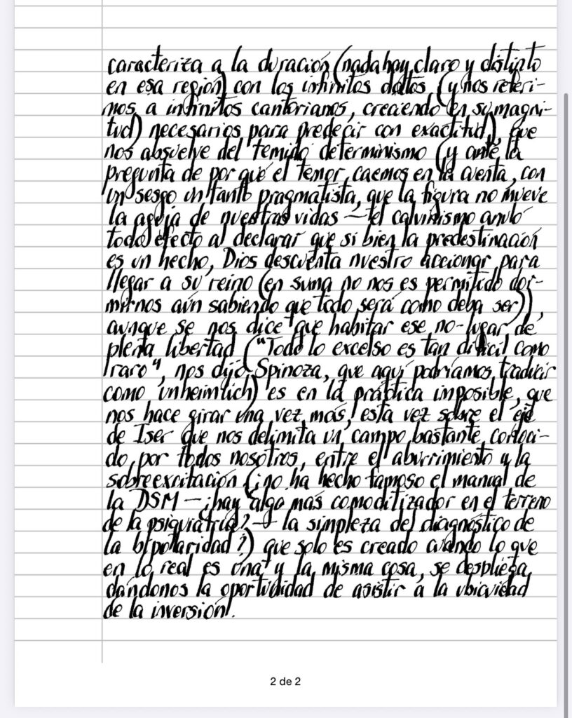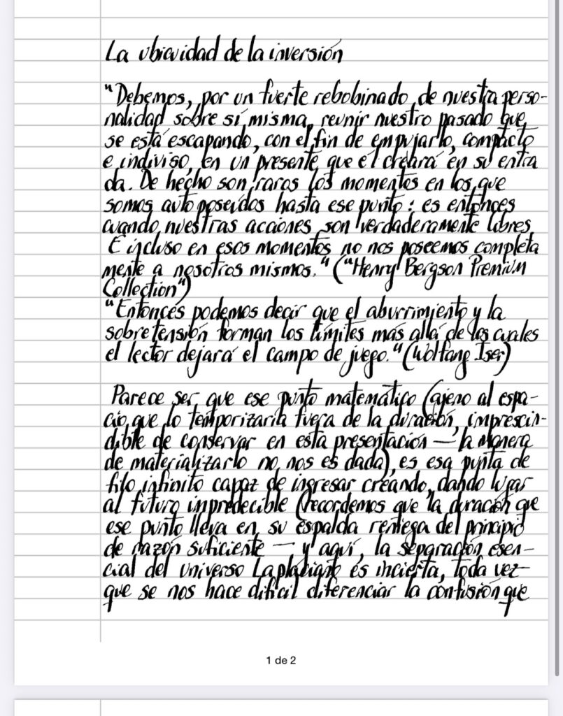 Parece ser que ese punto matemático (ajeno al espacio que lo temporizaría fuera de la duración, imprescindible de conservar en esta presentación – la manera de materializarlo no nos es dada), es esa punta de filo infinito capaz de ingresar creando, dando lugar al futuro impredecible (recordemos que la duración que ese punto lleva en su espalda reniega del princisio de razón suficiente – y aquí, la separación esencial del universo Laplaciano es incierta, toda vez que se nos hace difícil diferenciar la confusión que caracteriza a la duración (nada hay claro y distinto en esa región) con los infinitos datos (y nos referimos a infinitos cantorianos, creciendo en su magnitud) necesarios para predecir con exactitud), que nos absuelve del temido determinismo (y ante la pregunta de por qué el temor caemos en la cuenta, con un sesgo un tanto pragmatista, que la figura no mueve la aguja de nuestras vidas – el calvinismo anuló todo efecto al declarar que si bien la predestinación es un hecho, Dios descuenta nuestro accionar para llegar a su reino (en suma no nos es permitido dormirnos aún sabiendo que todo será como deba ser)), aunque se nos dice que habitar ese no-lugar de plena libertad («Todo lo excelso es tan difícil como raro», nos dijo Spinoza, que aquí podríamos traducir como unheimlich) es en la práctica imposible, que nos hace girar una vez más, esta vez sobre el eje de Iser que nos delimita un campo bastante conocido por todos nosotros, entre el aburrimiento a la sobreexcitación (¿no ha hecho famoso el manual de la DSM – ¿hay algo más comoditizador en el terreno de la psiquiatría? – la simpleza del diagnóstico de la bipolaridad?) que solo es creado cuando lo que en lo real es una y la misma cosa, se despliega dándonos la oportunidad de asistir a la ubicuidad de la inversión.