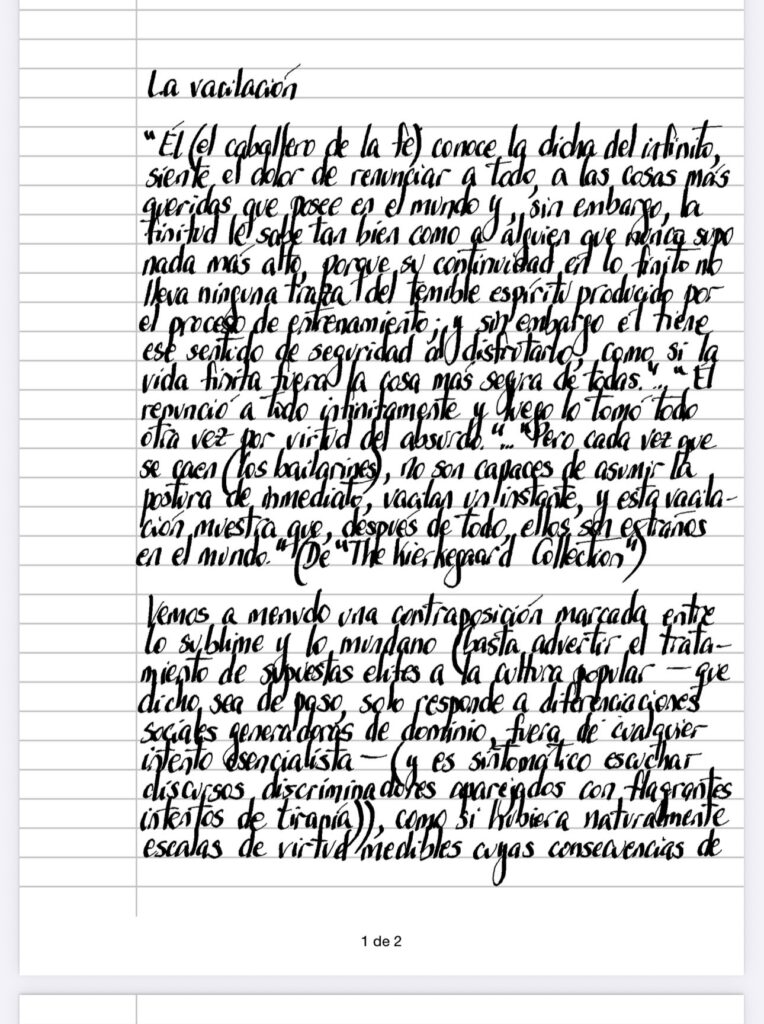 «Él (el caballero de la fe) conoce la dicha del infinito, siente el dolor de renunciar a todo, a las cosas más queridas que posee en el mundo y, sin embargo, la finitud le sabe tan bien como a alguien que nunca supo nada más alto, porque su continuidad en lo finito no lleva ninguna traza del temible espíritu producido por el proceso de entrenamiento; y sin embargo él tiene ese sentido de seguridad al disfrutarlo, como si la vida finita fuera la cosa más segura de todas.»…»Él renunció a todo infinitamente y luego lo tomó todo otra vez por virtud del absurdo.»…»Pero cada vez que se caen (los bailarines), no son capaces de asumir la postura de inmediato, vacilan un instante, y esta vacilación muestra que, después de todo, ellos son extraños en el mundo.» (De «The Kierkegaard Collection»)