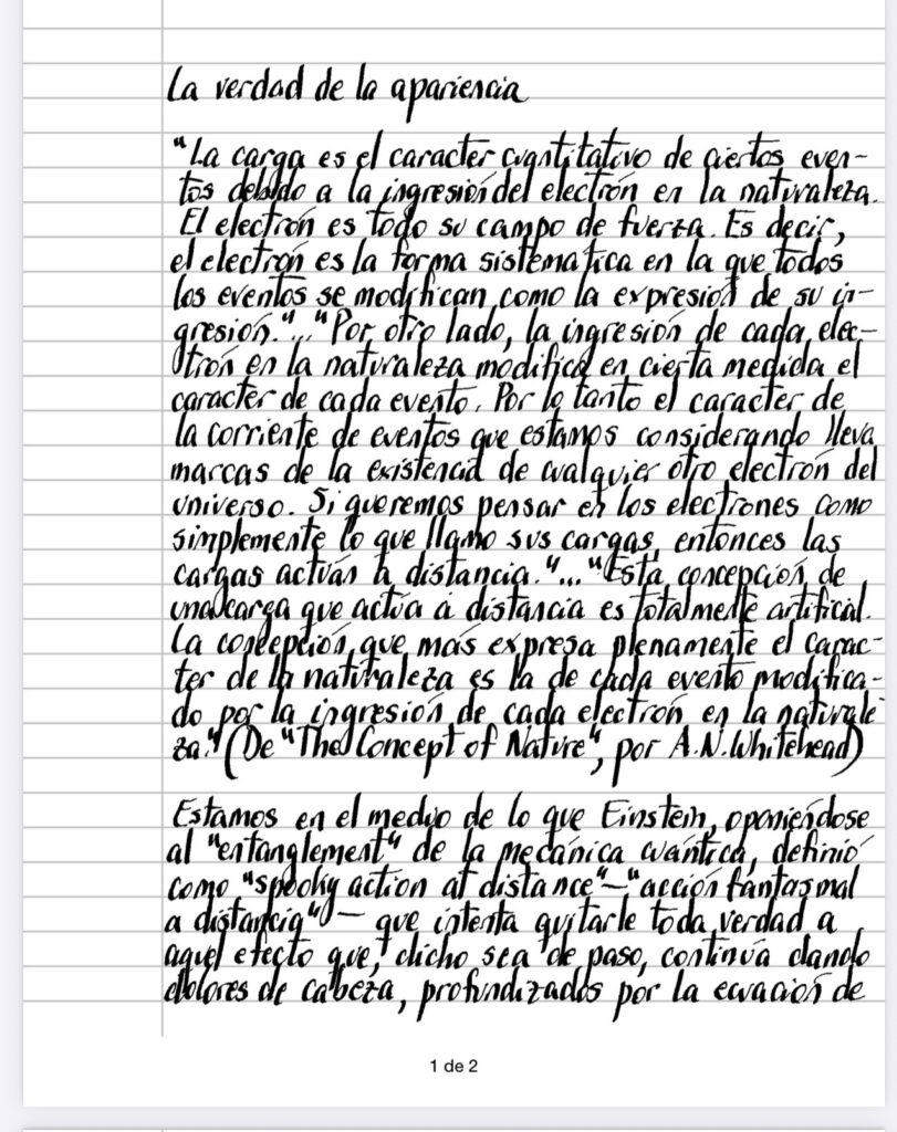 «La carga es el caracter cuantitativo de ciertos eventos debido a la ingresión del electrón en la naturaleza. El electrón es todo su campo de fuerza. Es decir, el electrón es la forma sistemática en la que todos los eventos se modifican como la expresión de su ingresión.»…»Por otro lado, la ingresión de cada electrón en la naturaleza modifica en cierta medida el caracter de cada evento. Por lo tanto el caracter de la corriente de eventos que estamos considerando lleva marcas de la existencia de cualquier otro electrón del universo. Si queremos pensar en los electrones como simplemente lo que llamo sus cargas, entonces las cargas actuán a distancia.»…»Esta concepción de una carga que actúa a distancia es totalmente artificial. La concepción que más expresa plenamente el caracter de la naturaleza es la de cada evento modificado por la ingresión de cada electrón en la naturaleza.» (De «The Concept of Nature», por A. N. Whitehead)