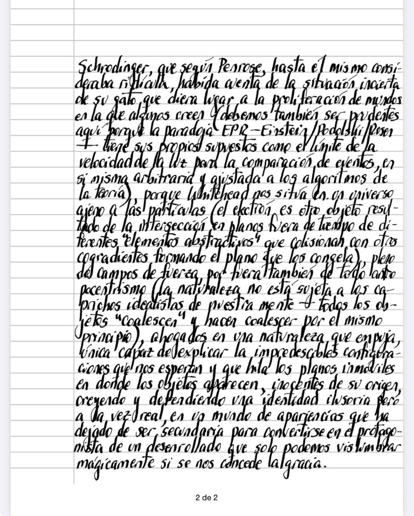 Estamos en el medio de lo que Einstein, oponiéndose al «entanglement» de la mecánica cuántica, definió como «spooky action at distance» – «acción fantasmal a distancia» – que intenta quitarle toda verdad a aquel efecto que, dicho sea de paso, continúa dando dolores de cabeza, profundizados por la ecuación de Schrodinger, que según Penrose, hasta él mismo consideraba ridícula, habida cuenta de la situación incierta de su gato que diera lugar a la proliferación de mundos en la que algunos creen (debemos también ser prudentes aquí porque la paradoja EPR-Einstein/Podolski/Rosen tiene sus propios supuestos como el límite de la velocidad de la luz para la comparación de eventos, en si misma arbitraria y ajustada a los algoritmos de la teoría), porque Whitehead nos sitúa en un universo ajeno a las partículas (el electrón es otro objeto resultado de la intersección en planos fuera de tiempo de diferentes “elementos abstractivos» que colisionan con otros cogradientes formando el plano que los congela), pleno de campos de fuerza, por fuera también de todo antropocentrismo (la naturaleza no está sujeta a los caprichos idealistas de nuestra mente – todos los objetos «coalescen» y hacen coalescer por el mismo principio, ahogados en una naturaleza que empuja, única capaz de explicar la impredecibles configuraciones que nos esperan y que hila los planos inmóviles en donde los objetos aparecen, inocentes de su origen, creyendo y defendiendo una identidad ilusoria pero a la vez real, en un mundo de apariencias que ha dejado de ser secundario para convertirse en el protagonista de un desenrollado que solo podemos vislumbrar mágicamente si se nos concede la gracia.