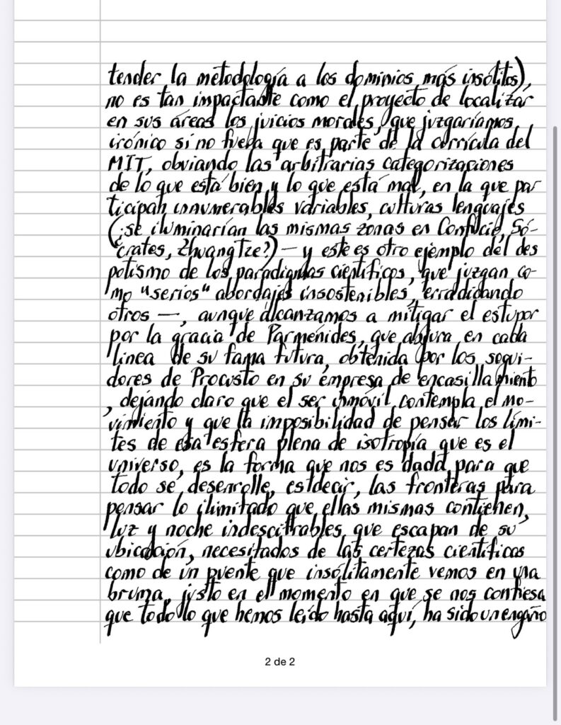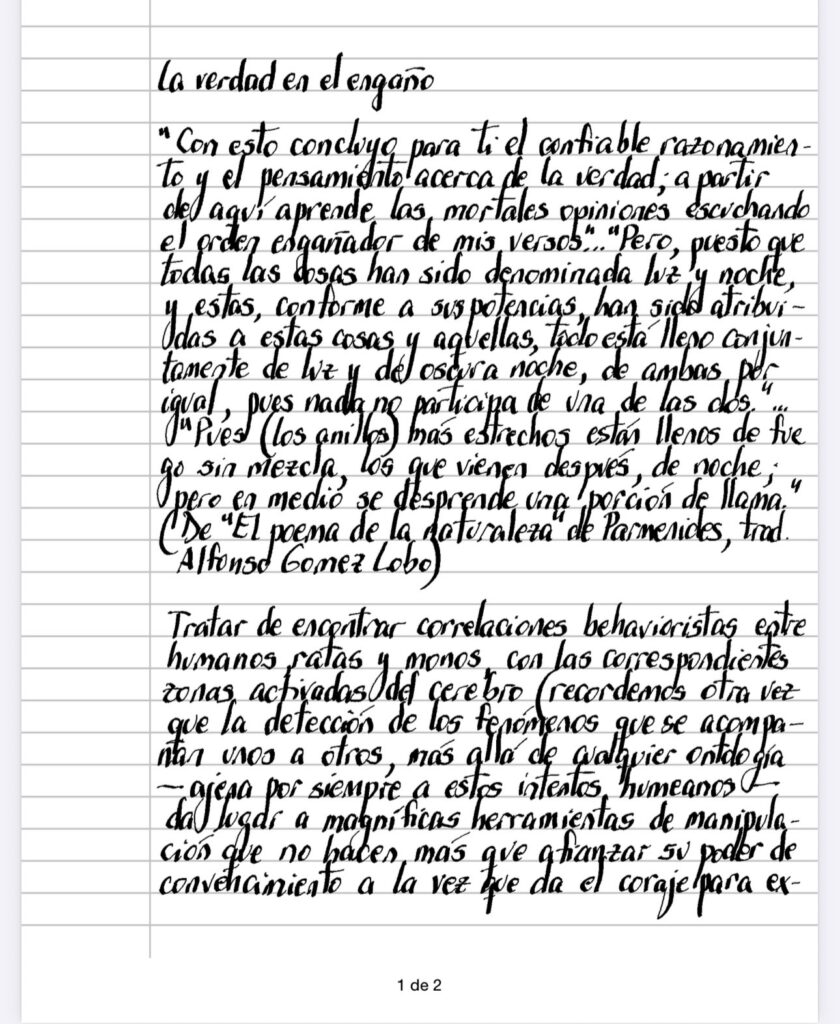 Tratar de encontrar correlaciones behavioristas entre humanos, ratas y monos, con las correspondientes zonas activadas del cerebro (recordemos otra vez que la detección de los fenómenos que se acompañan unos a otros, más allá de cualquier ontología – ajena por siempre a estos intentos humeanos – da lugar a magníficas herramientas de manipulación que no hacen más que afianzar su poder de convencimiento a la vez queda el coraje para extender la metodología a los dominios más insólitos), no es tan impactante como el proyecto de localizar en sus areas los juicios morales, que juzgaríamos irónico si no fuera que es parte de la currícula del MIT, obviando las arbitrarias categorizaciones de lo que está bien y lo que está mal, en la que participan innumerables variables, culturas lenguajes (¿se iluminarían las mismas zonas en Confucio, Sócrates, Zhuang Tre?) – y este es otro ciemplo del despotismo de los paradigmas científicos, que juzgan como «serios» abordajes insostenibles, erradicando otros -, aunque alcanzamos a mitigar el estupor por la gracia de Parménides, que abjura en cada linea de su fama futura, obtenida por los seguidores de Procusto en su empresa de encasillamiento, dejando claro que el ser inmóvil contempla el movimiento y que la imposibilidad de pensar los límites de esa esfera plena de isotropía que es el universo, es la forma que nos es dada para que todo se desenrolle, es decir, las fronteras para pensar lo ilimitado que ellas mismas contienen, luz y noche indescifrables que escapan de su ubicación, necesitados de las certezas científicas como de un puente que insólitamente vemos en una bruma, justo en el momento en que se nos confiesa que todo lo que hemos leído hasta aquí, ha sido un engaño