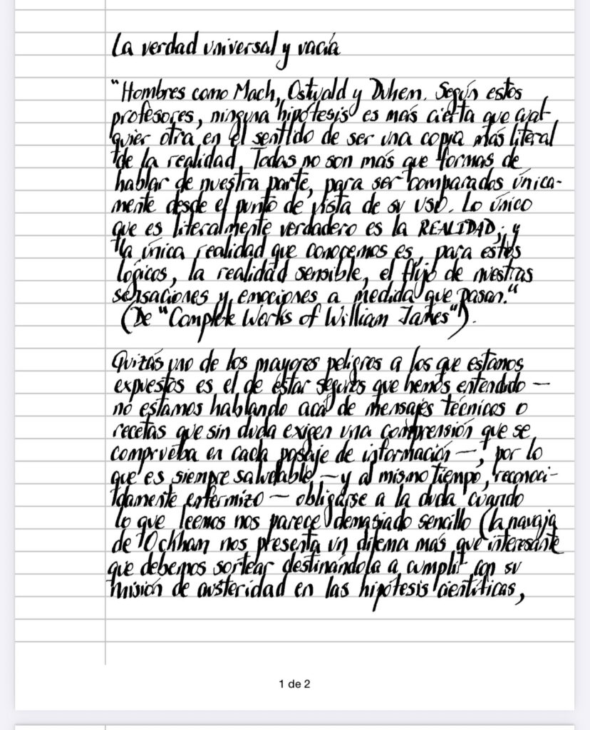 «Hombres como Mach, Ostwald y Duhem. Según estos profesores, ninguna hipótesis es mas cierta que cualquier otra en el sentido de ser una copia mas literal de la realidad. Todas no son mas que formas de hablar de nuestra parte, para ser comparados únicamente desde el punto de vista de su uso. Lo único que es literalmente verdadero es la REALIDAD; y la única realidad que conocemos es, para estos lógicos, la realidad sensible, el flujo de nuestras sensaciones y emociones a medida que pasan.» (De «Complete Works of William James»).