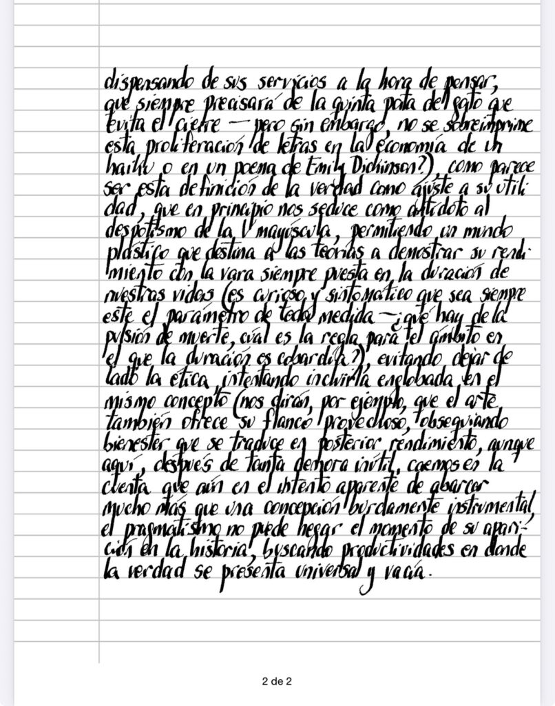Quizás uno de los mayores peligros a los que estamos expuestos es el de estar seguros que hemos entendido – no estamos hablando acá de mensajes técnicos o recetas que sin duda exigen una comprensión que se comprueba en cada pasaje de información -, por lo que es siempre saludable – y al mismo tiempo, reconocidamente enfermizo – obligarse a la duda cuando lo que leemos nos parece demasiado sencillo (la navaja de Ockham nos presenta un dilema más que interesante que debemos sortear destinándola a cumplir con su misión de austeridad en las hipótesis científicas, dispensando de sus servicios a la hora de pensar, que siempre precisará de la quinta pata del gato que evita el cierre – pero sin embargo, no se sobreimprime esta proliferación de letras en la economía de un haiku o en un poema de Emily Dickinson?), como parece ser esta definición de la verdad como ajuste a su utilidad, que en principio nos seduce como antídoto al despotismo de la V mayúcula, permitiendo un mundo plástico que destina a las teorías a demostrar su rendimiento con la vara siempre puesta en la duración de nuestras vidas (es curioso y sintomático que sea siempre este el parámetro de toda medida -¿qué hay de la pulsión de muerte, cuál es la regla para el ámbito en el que la duración es cobardía?), evitando dejar de lado la ética, intentando incluirla englobada en el mismo concepto (nos dirán, por ejemplo, que el arte también ofrece su flanco provechoso, obsequiando bienestar que se traduce en posterior rendimiento), aunque aquí, después de tanta demora inútil, caemos en la cuenta que aún en el intento aparente de abarcar mucho más que una concepción burdamente instrumental, el pragmatismo no puede negar el momento de su aparición en la historia, buscando productividades en donde la verdad se presenta universal y vacía.