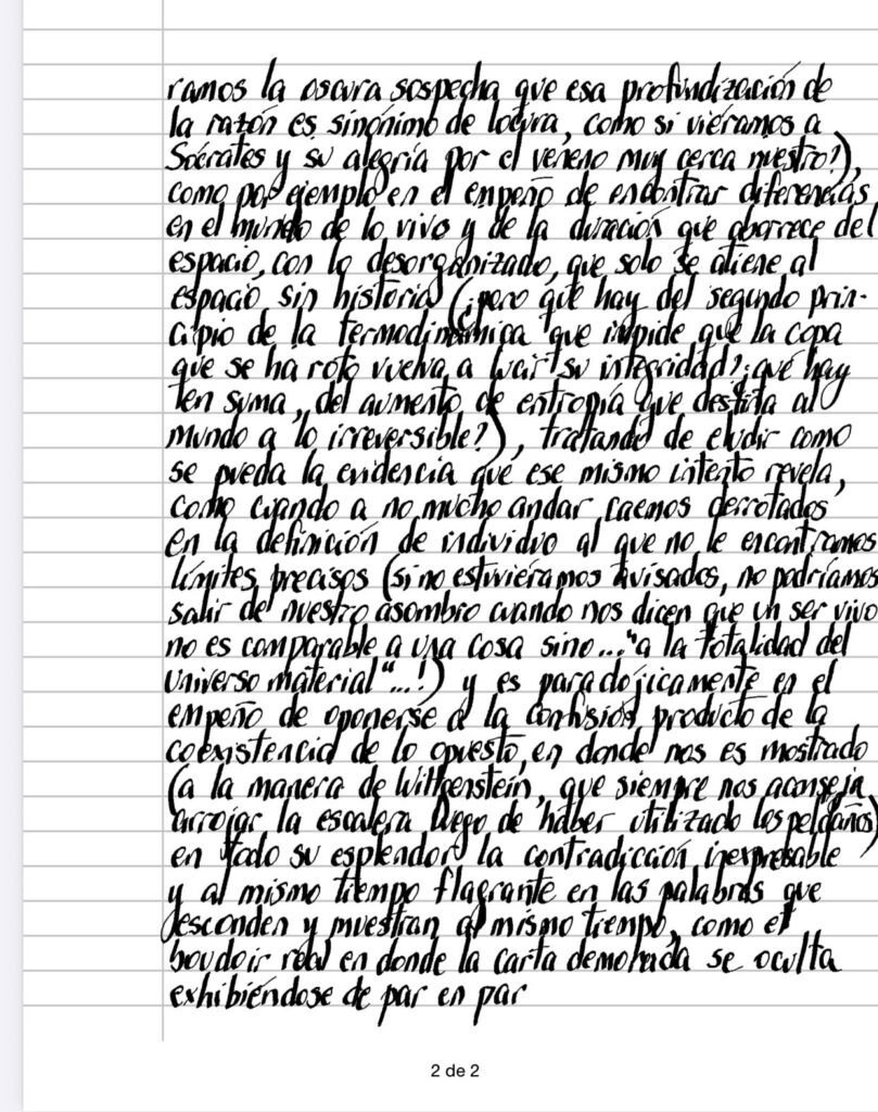 Es interesante comprobar como en el esfuerzo de probar una hipótesis, se amanece exactamente en su opuesto, como si una especie de maldición (bendi­ción) socrática inundara nuestro pensamiento cada vez que nos aventuramos a aguas abiertas (¿será por eso la tendencia casi inevitable a los sistemas cerrados y a la necesidad de anclar al pensamiento el consi­guiente vértigo que decidimos cortar cuando la reflexión se prolonga mas allá de lo aconsejable, como si tuviéramos la oscura sospecha que esa profundización de la razón es sinónimo de locura, como si viéramos a Sócrates y su alegría por el veneno muy cerca nuestro?), como por ejemplo en el empeño de encontrar diferencias en el mundo de lo vivo y de la duración que aborrece del espacio, con lo desorganizado, que solo se atiene al espacio sin historia (¿pero que hay del segundo prin­cipio de la termodinámica que impide que la copa que se ha roto vuelva a lucir su integridad?¿qué hay en suma, del aumento de entropía que destina al mundo a lo irreversible?), tratando de eludir como se pueda la evidencia que ese mismo intento revela, como cuando a no mucho andar caemos derrotados en la definición de individuo al que no le encontramos límites precisos (si no estuviéramos avisados, no podríamos salir de nuestro asombro cuando nos dicen que un ser vivo no es comparable a una cosa sino…’a la totalidad del universo material’…!) y es paradójicamente en el empeño de oponerse a la confusión producto de la coexistencia de lo opuesto, en donde nos es mostrado (a la manera de Wittgenstein, que siempre nos aconseja arrojar la escalera luego de haber utilizado los peldaños) en todo su esplendor la contradicción inexpresable y al mismo tiempo flagrante en las palabras que esconden y muestran al mismo tiempo, como el boudoir real en donde la carta demorada se oculta exhibiéndose de par en par.