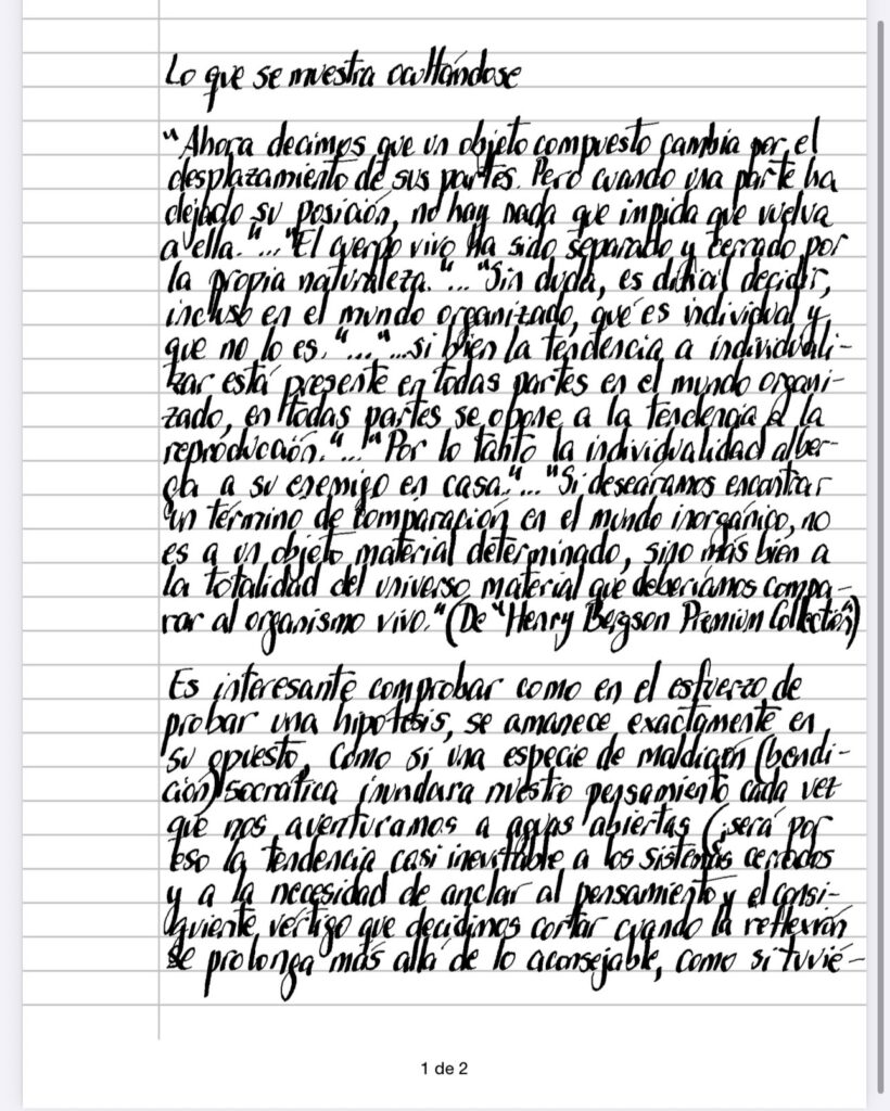 «Ahora decimos que un objeto compuesto cambia por el desplazamiento de sus partes. Pero cuando una parte ha dejado su posición, no hay nada que impida que vuelva a ella.»…»El cuerpo vivo ha sido separado y cerrado por la propia naturaleza.»…» Sin duda, es difícil decidir, incluso en el mundo organizado, qué es individual y que no lo es.»…»… si bien la tendencia a individuali­zar está presente en todas partes en el mundo organi­zado, en todas partes se opone a la tendencia a la reproducción.»…»Por lo tanto la individualidad alberga a su enemigo en casa..»…»Si deseáramos encontrar un término de comparación en el mundo inorgánico, no es a un objeto material determinado, sino mas bien a la totalidad del universo material que deberíamos compa­rar al organismo vivo.» (De «Henry Bergson Premium Collection”).