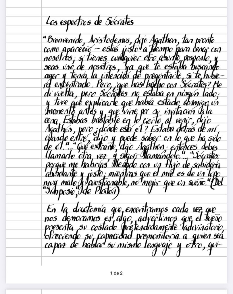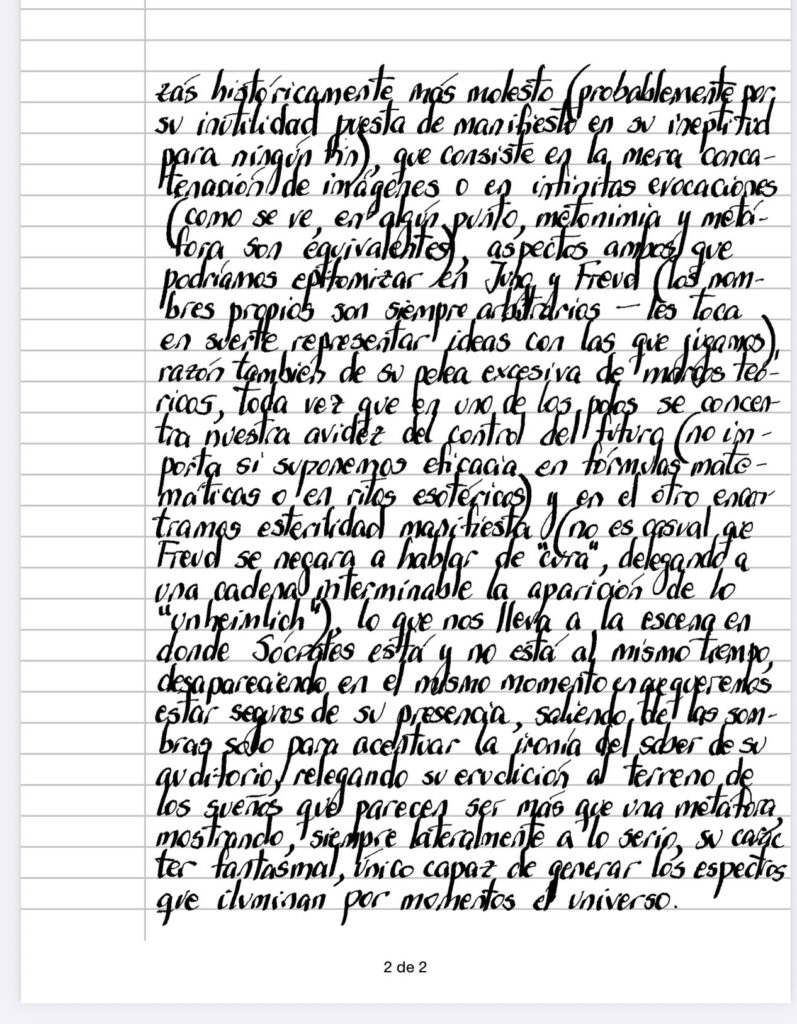 En la dicotomía que encontramos cada vez que nos demoramos en algo, advertimos que el sueño presenta su costado pretendidamente adivinatorio, ofreciendo su capacidad premonitoria a quien sea capaz de hablar su mismo lenguaje y otro, quizas históricamente más molesto (probablemente por su inutilidad puesta de manifiesto en su ineptitud para ningún fin), que consiste en la mera conca­tenación de imágenes o en infinitas evocaciones (como se ve, en algún punto, metonimia y metá­fora son equivalentes), aspectos ambos que podríamos epitomizar en Jung y Freud (los nom­bres propios son siempre arbitrarios – les toca en suerte representar ideas con las que jugamos), razón también de su pelea excesiva de marcos teó­ricos, toda vez que en uno de los polos se concen­tra nuestra avidez del control del futuro (no im­porta si suponemos eficacia en fórmulas mate­máticas o en ritos esotéricos) y en el otro encon­tramos esterilidad manifiesta (no es casual que Freud se negara a hablar de» cura», delegando a una cadena interminable la aparición de lo «unheimlich»), lo que nos lleva a la escena en donde Sócrates está y no está al mismo tiempo, desapareciendo en el mismo momento en que queremos estar seguros de su presencia, saliendo de las som­bras solo para acentuar la ironía del saber de su auditorio, relegando su erudición al terreno de los sueños que parecen ser más que una metáfora, mostrando, siempre lateralmente a lo serio, su carac­ter fantasmal, único capaz de generar los espectros que iluminan por momentos el universo.