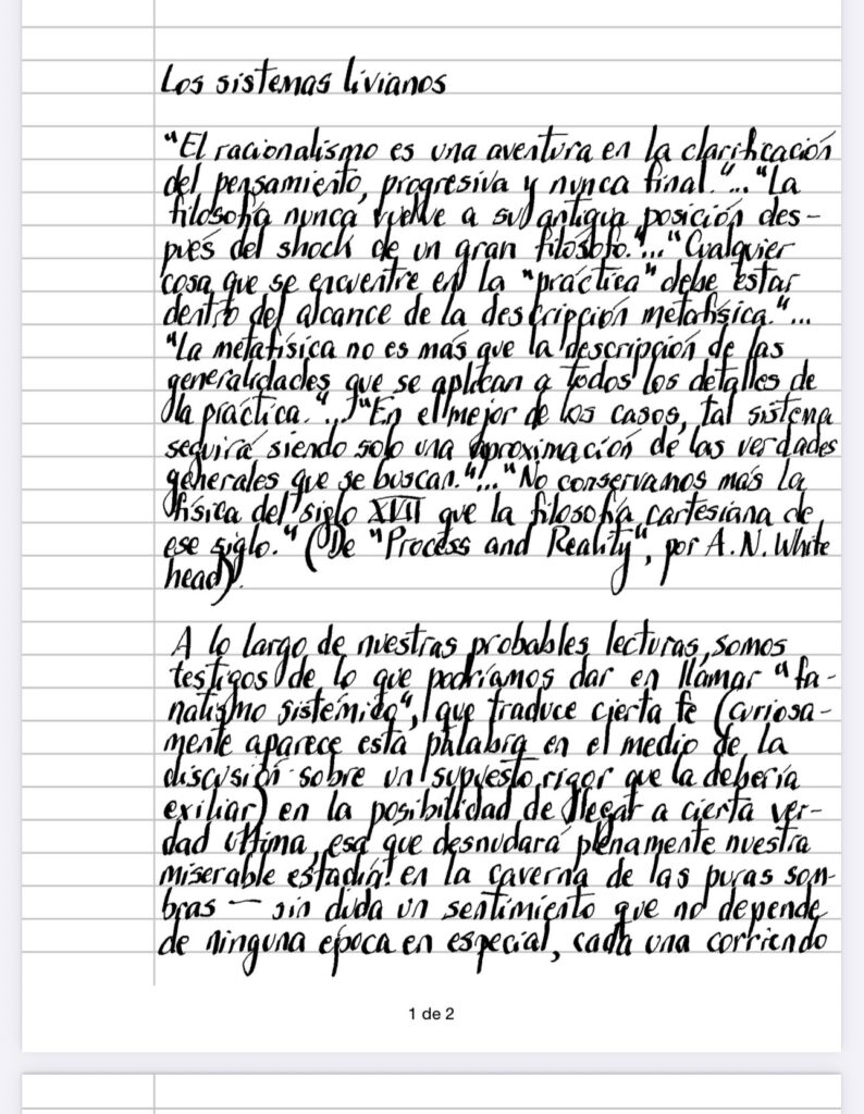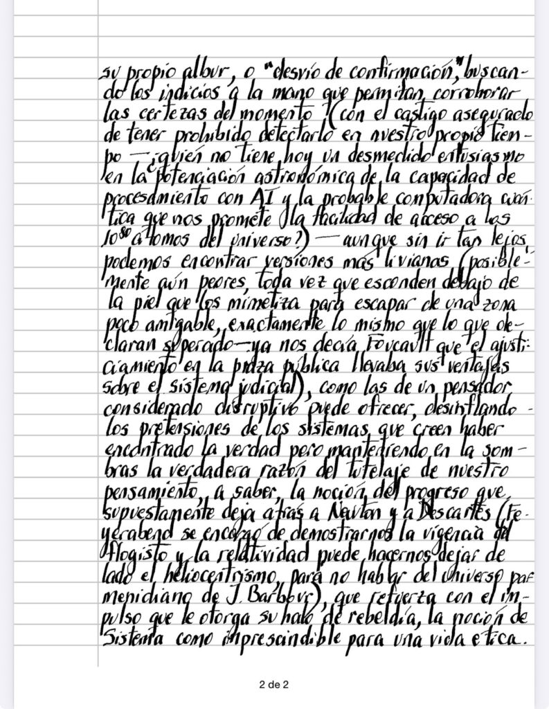 A lo largo de nuestras probables lecturas, somos testigos de lo que podríamos dar en llamar «fanatismo sistémico», que traduce cierta fe (curiosamente aparece esta palabra en el medio de la discusión sobre un supuesto rigor que la debería exiliar) en la posibilidad de llegar a cierta verdad última, esa que desnudará plenamente nuestra miserable estadía en la caverna de las puras sombras – sin duda un sentimiento que no depende de ninguna época en especial, cada una corriendo su propio albur, o «desvío de confirmación», buscando los indicios a la mano que permitan corroborar las certezas del momento (con el castigo asegurado de tener prohibido detectarlo en nuestro propio tiempo – ¿quién no tiene hoy un desmedido entusiasmo en la potenciación astronómica de la capacidad de procesamiento con AI y la probable computadora cuántica que nos promete la facilidad de acceso a los 10^80 átomos del universo?) aunque sin ir tan lejos, podemos encontrar versiones más livianas (posiblemente aún peores, toda vez que esconden debajo de la piel que los mimetiza para escapar de una zona poco amigable, exactamente lo mismo que lo que declaran superado – ya nos decía Foucault que el ajusticiamiento en la plaza pública llevaba sus ventajas sobre el sistema judicial), como las de un pensador. considerado disruptivo puede ofrecer, desinflando. los pretensiones de los sistemas que creen haber encontrado la verdad pero manteniendo en la sombras la verdadera razón del tutelaje de nuestro pensamiento, a saber, la noción del progreso que supuestamente deja atrás a Newton y a Descartes (Feyerabend se encargó de demostrarnos la vigencia del flogisto y la relatividad puede hacernos dejar de lado el heliocentrismo, para no hablar del universo parmenidiano de J. Barbour), que refuerza con el impulso que le otorga su halo de rebeldía, la noción de Sistema como imprescindible para una vida ética.