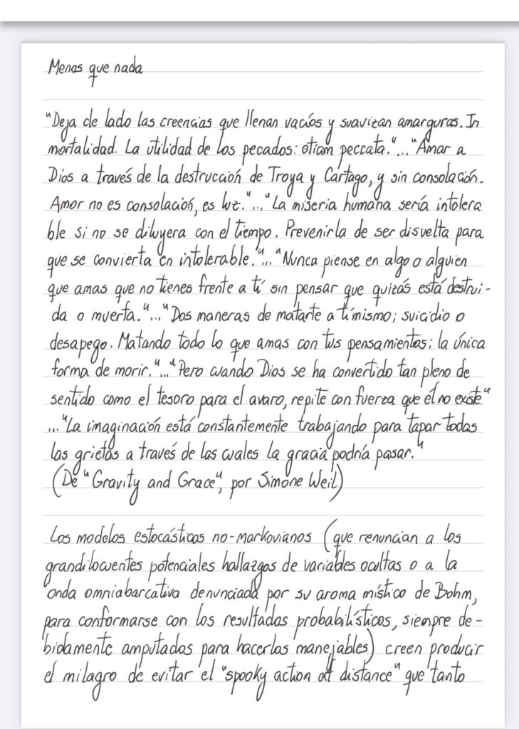 «Deja de lado las creencias que llenan vacíos y suavizan amarguras. Inmortalidad. La utilidad de las pecados: etiam peccata…»Amar a Dios a través de la destrucción de Troya y Cartago, y sin consolación. Amor no es consolación , es luz.»…“La miseria humana sería intolerable si no se diluyera con el tiempo. Prevenirla de ser disuelta para que se convierta en intolerable. «.» Nunca pienses en algo o alguien que amas que no tienes frente a ti sin pensar que quizás esté destruida o muerta.”…» Dos maneras de matarte a ti mismo; suicidio o desapego. Matando todo lo que amas con tus pensamientos: la única forma de morir.. Pero cuando Dios se ha convertido tan pleno de sentido como el tesoro para el avaro, repite con fuerza que él no existe»…”La imaginación está constantemente trabajando para tapar todas las grietas a través de las cuales la gracia podría pasar.” (De «Gravity and Grace», por Simone Weil)