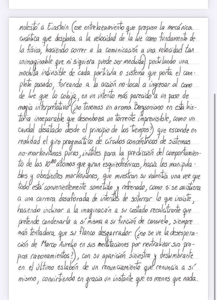 Los modelos estocásticos no-markovianos (que renuncian a los grandilocuentes potenciales hallazgos de variables ocultas o a la onda omniabarcante denunciada por su aroma místico de Bohm, para conformarse con los resultados probabilísticos, siempre debidamente amputados para hacerlos manejables) creen producir el milagro de evitar el ‘spooky action of distance’ que tanto molestó a Einstein (ese entrelazamiento que propuso la mecánica cuántica que desplaza a la velocidad de la luz como fundamento de la física, haciendo correr a la comunicación a una velocidad tan inimaginable que ni siquiera puede ser medida), postulando una mochila indivisible de cada partícula o sistema que porta el completo pasado, forzando a la acción no-local a ingresar al cono de luz que lo cobija, en un intento más parecido a un pase de magia interpretativo (no tenemos un aroma Bergsoniano en esta historia inseparable que desemboza un torrente imprevisible, como un caudal desatado desde el principio de los tiempos?) que esconde en realidad el giro pragmático de círculos concéntricos de sistemas no-markovianos puros, inútiles para la predicción del comportamiento de los 10 a las 80 átomos que giran esquizofrénicos, hacia las manipulables y obedientes markovianos que muestran su valentía una vez que todo está convenientemente sometido y refrenado, como si se asistiera a una carrera desaforada de intentos de soterrar lo que insiste, haciendo inclinar a la imaginación a su costado recalcitrante que pretende condenar a sí misma a su función de consuelo, siempre más tentadora que su flanco desgarrador (no se ve la desesperación de Marco Aurelio en sus meditaciones por neutralizar sus propios razonamientos?), con su aparición siniestra y deslumbrante en el último eslabón de un renunciamiento que renuncia a sí mismo, convirtiendo en gracia un instante que es menos que nada.