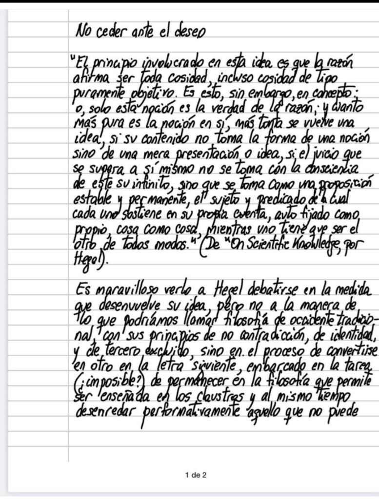 Es maravilloso verlo a Hegel debatirse en la medida que desenvuelve su idea, pero no a la manera de lo que podríamos llamar filosofía de occidente tradicional, con sus principios de no contradicción, de identidad, y de tercero excluido, sino en el proceso de convertirse en otro en la letra siguiente, embarcado en la tarea (¿imposible?) de permanecer en la filosofía que permite ser enseñada en los claustros y al mismo tiempo desenredar performativamente aquello que no puede ser enseñado — y desde Sócrates deberíamos decir que la filosofía no puede ser enseñada sino exhibida en su señalización —, sino mostrado (¿no es este intento todo lo contrario a la sugerencia de callar sobre lo que no se puede hablar que nos diera Wittgenstein?) en el mismo proceso de escritura, que corre permanentemente el riesgo y el albur de creer que ha llegado al mismo tiempo que se congela y debe volver a empezar, en un ida y vuelta sin fin solo apto al coraje filosófico que prefiere la angustia de Sísifo a ceder al deseo que a esta altura podríamos definir como la obsesión de una idea que se niega a ser desalojada (y en Hegel podemos vislumbrarla en la forma de ser y no ser al mismo tiempo, su manera de rodear ese proceso inabarcable), pero que a la vez nos da el motivo para vivir y desenvolver nuestra parte — que también es el todo— del universo.
