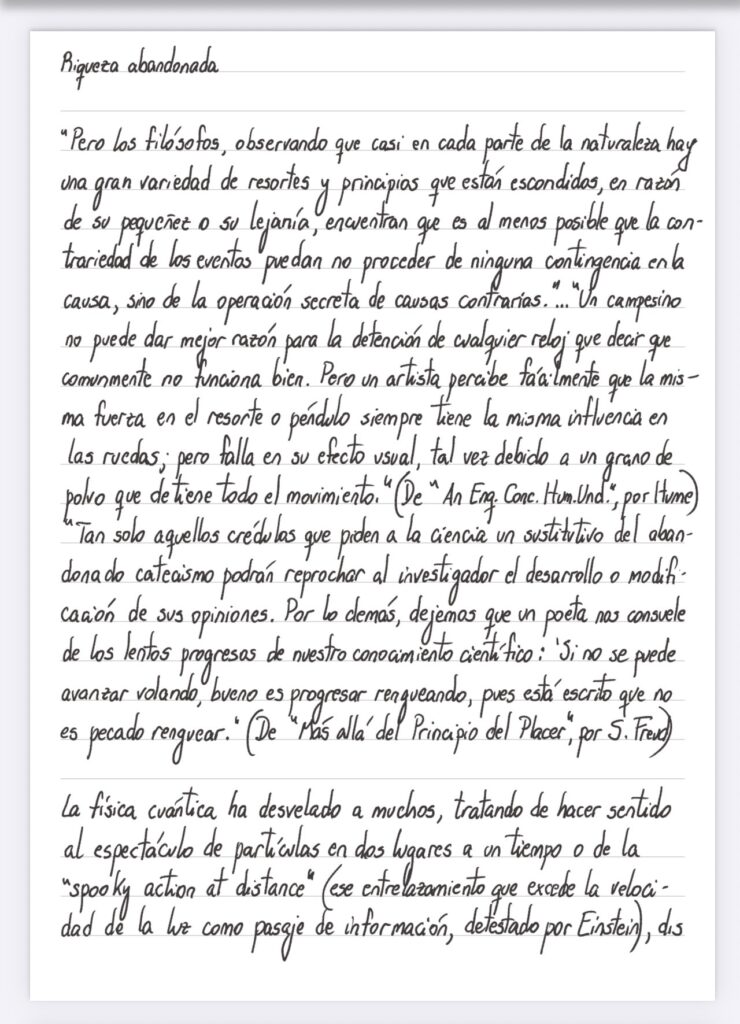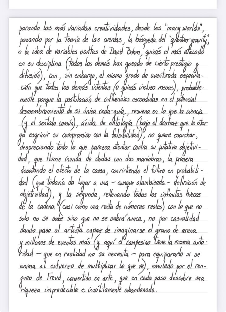 La física cuántica ha desvelado a muchos, tratando de hacer sentido al espectáculo de partículas en dos lugares a un tiempo o de la «spooky action at distance» (ese entrelazamiento que excede la velocidad de la luz como pasaje de información, detestado por Einstein), disparando las más variadas creatividades, desde los «many worlds» pasando por la teoría de las cuerdas, la búsqueda del «quantum-gravity» o la idea de variables ocultas de David Bohm, quizás el más atacado en su disciplina (todos los demás han gozado de cierto prestigio y difusión), con, sin embargo, el mismo grado de aventurada especulación que todos los demás intentos (o quizás incluso menos), probablemente porque la postulación de influencias escondidas en el potencial desmembramiento de su única onda-guía, resuena en lo que la ciencia (y el sentido común), ávida de ontología (bajo el disfraz que le otorga esgrimir su compromiso con la falsibilidad), no quiere escuchar, despreciando todo lo que parezca atentar contra su putativa objetividad, que Hume inunda de dudas con dos maniobras, la primera desatando el efecto de la causa, convirtiendo el futuro en probabilidad (que todavía da lugar a una —aunque alambicada— definición de objetividad), y la segunda, rellenando todos los infinitos huecos de la cadena (casi como una recta de números reales) con lo que no solo no se sabe sino que no se sabrá nunca, no por casualidad dando paso al artista capaz de imaginarse el grano de arena y millones de eventos más (y aquí el campesino tiene la misma autoridad —que en realidad no se necesita— para equipararlo si se anima al esfuerzo de multiplicar lo que ve), emulado por el rengueo de Freud, convertido en arte, que en cada paso descubre una riqueza impredecible e insólitamente abandonada.